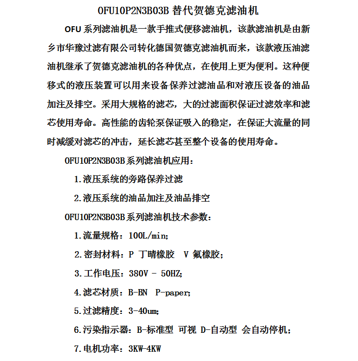 賀德克移動式濾油機OFU10P2N3B03B