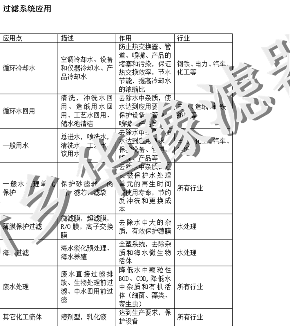 發電廠:用于電廠鍋爐高純水制備的精度預處理部分,發電機冷卻水、密封用水的過濾,系13-4統用水量特大時可作為旁濾處理使用