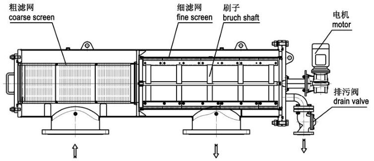 污水由設(shè)備的入水口進(jìn)入過濾器內(nèi),粗濾網(wǎng)先對(duì)污水中的體積較大的雜質(zhì)進(jìn)行攔截,防止這些雜質(zhì)進(jìn)入機(jī)體內(nèi)部后損壞機(jī)體內(nèi)的部件。粗濾后的水流向機(jī)體另一端的細(xì)濾網(wǎng),細(xì)濾網(wǎng)對(duì)水中的雜質(zhì)及污物進(jìn)行最后的攔截。因?yàn)槲酃笇?duì)濾網(wǎng)的堵塞,使濾網(wǎng)中的水和濾網(wǎng)外的水產(chǎn)生壓力差,當(dāng)這個(gè)壓力差達(dá)到壓差開關(guān)的設(shè)定數(shù)值時(shí),電控箱發(fā)出清洗、排污信號(hào),控制機(jī)體上的排污閥與清掃電機(jī)同時(shí)打開。電機(jī)轉(zhuǎn)動(dòng)帶動(dòng)機(jī)體內(nèi)的不繡鋼刷對(duì)濾網(wǎng)上的污垢進(jìn)行清理,再通過排污口排出污水,完成一次自清洗過程。該過濾器同時(shí)安裝有定時(shí)控制器,可在一定時(shí)間間隔內(nèi)定時(shí)排污。