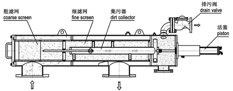 污水自入水口進(jìn)入,經(jīng)過粗、細(xì)濾網(wǎng)過濾,然后流向出口。在過濾過程中,細(xì)濾網(wǎng)表面逐漸積累水中的雜質(zhì)。形成過濾雜質(zhì)層。由于雜質(zhì)堆積在細(xì)濾網(wǎng)的內(nèi)側(cè),因此在細(xì)濾網(wǎng)的內(nèi)、外兩側(cè)就形成了一個(gè)壓力差。當(dāng)壓差達(dá)到系統(tǒng)預(yù)設(shè)值時(shí),自動(dòng)清洗功能被啟動(dòng),此間系統(tǒng)的供水不中斷,排污閥打開, 污水由排污閥排出。此時(shí)水力馬達(dá)室及集污器內(nèi)的壓力大幅下降,開始吸污過程:此時(shí)同樣一股很強(qiáng)的反沖洗水流向外部,吸嘴上產(chǎn)生一股吸力再加上水流經(jīng)過水力馬達(dá)時(shí),由于液壓活塞壓力下降,帶動(dòng)集污器繞軸進(jìn)行旋轉(zhuǎn)做軸向運(yùn)動(dòng),將整個(gè)細(xì)濾網(wǎng)內(nèi)表面完全清冼干凈。該過濾器同時(shí)安裝有定時(shí)控制器,可在一定時(shí)間間隔內(nèi)定時(shí)排污。